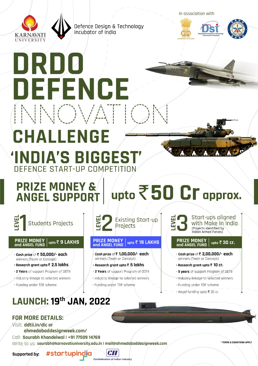 With a view to provide a platform to startups to come up with breakthrough innovations in the defence sector, Gandhinagar-based Karnavati University, in association with Defence Research and Development Organisation (DRDO), is all set to host a Defence Innovation Challenge. The competition, which was launched in January, is being organised by the Defence Design and Technology Incubator of India (DDTII), one of the leading defence incubator in India. The initiative is being supported by the Department of Science and Technology (DST), Government of Gujarat and is being held on the sidelines of the third edition of the Ahmedabad Design Week. The winning teams will be rewarded with prize money and angel funding worth upto Rs 50 crore.