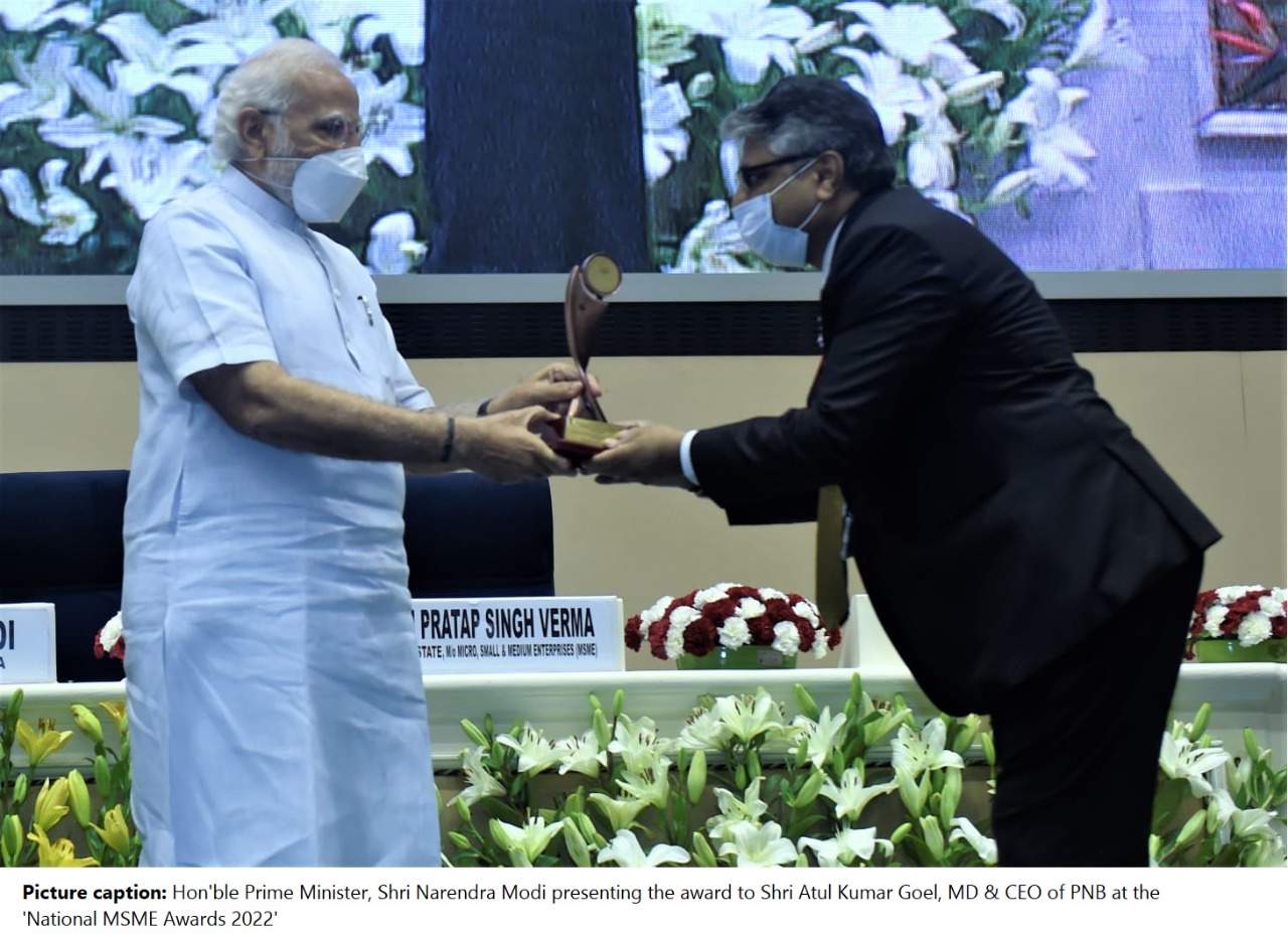 Punjab National Bank, nation’s leading public sector bank, won the third prize at  “National MSME Awards 2022” organized under the Entrepreneur-India programme by the Union Ministry of MSME in New Delhi. This award was presented by Hon’ble Prime Minister, Shri Narendra Modi, for PNB’s contribution towards the promotion and development of the MSME sector and was received by Shri Atul Kumar Goel, MD & CEO of PNB, at Vigyan Bhawan in New Delhi.