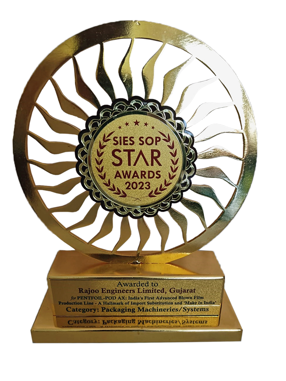 Rajoo Engineers Ltd, a pioneering force in the field of plastic processing machinery, has been recognized with the prestigious SIES SOP STAR 2023 Award for their groundbreaking innovation, the PENTAFOIL-POD-AX, the five layer (POD) blown film line for flexible packaging. The award from South India Education Society School of Packaging, Mumbai (SIES- SOP), presented in acknowledgment of excellence in import substitution and ‘Make in India’ initiatives, highlights the transformative impact of Rajoo’s indigenous technological advancements.